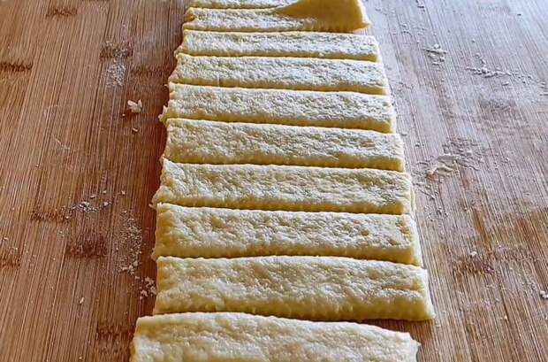 Раскатываем тесто в прямоугольный пласт толщиной 1 см. Делим пласт на небольшие полоски, выкладываем их на противень, застеленный пергаментом.