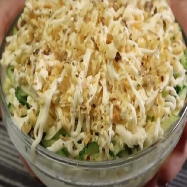 Смазываем слой сыра майонезом, посыпаем измельченным грецким орехом.